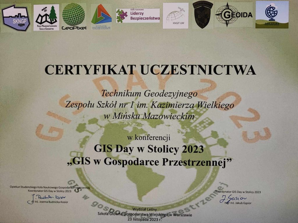 23 listopada uczniowie 2 i 3 klasy geodezyjnej wzięli udział w konferencji organizowanej przez Wydział Leśny na SGGW ? ? GIS Day to międzynarodowe święto miłośników i użytkowników Systemów Informacji Geograficznej. Uczniowie wysłuchali wykładów i zapoznali się z najnowszą technologią stosowaną w geodezji.