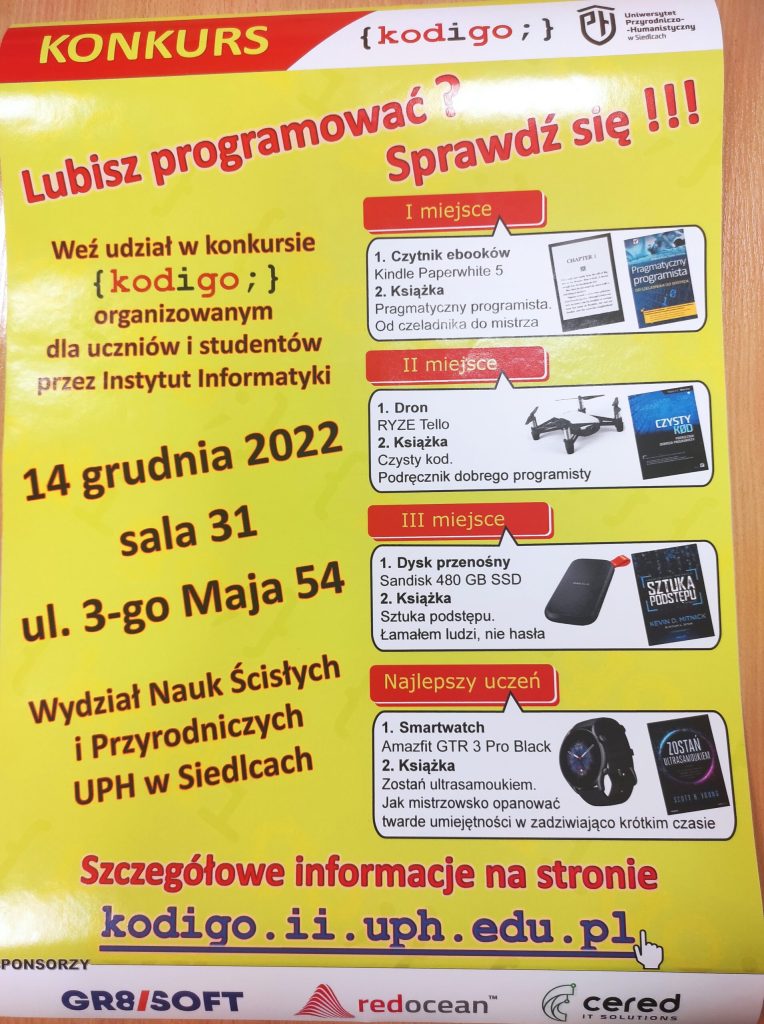 Lubisz programować? Sprawdź się! ? Zachęcamy do udziału w konkursie {kodigo ; }, do wygrania fantastyczne nagrody! Więcej szczegółów na kodigo.ii.uph.edu.pl.