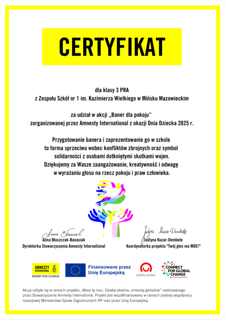 Certyfikat dla 3 PR A za udział w akcji „Baner dla pokoju”
