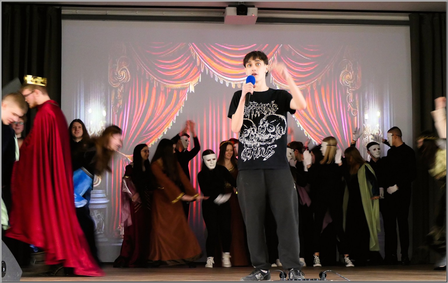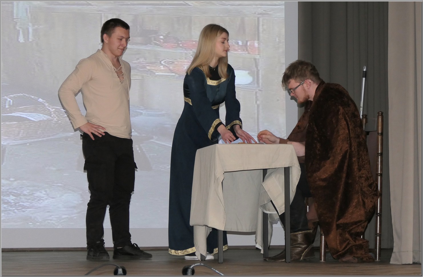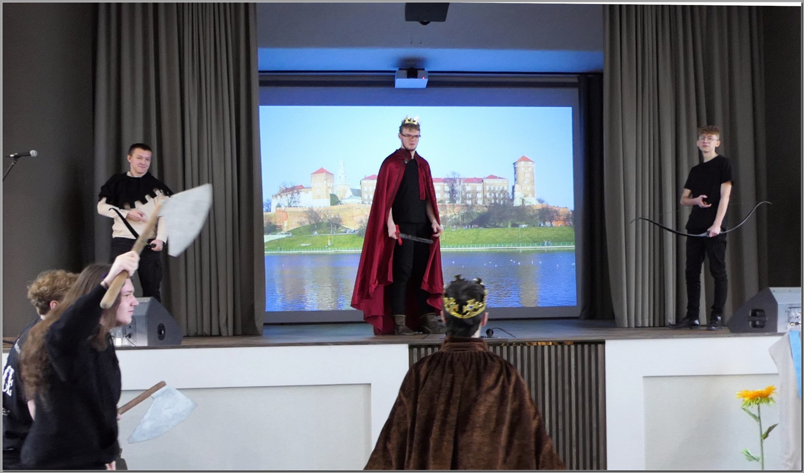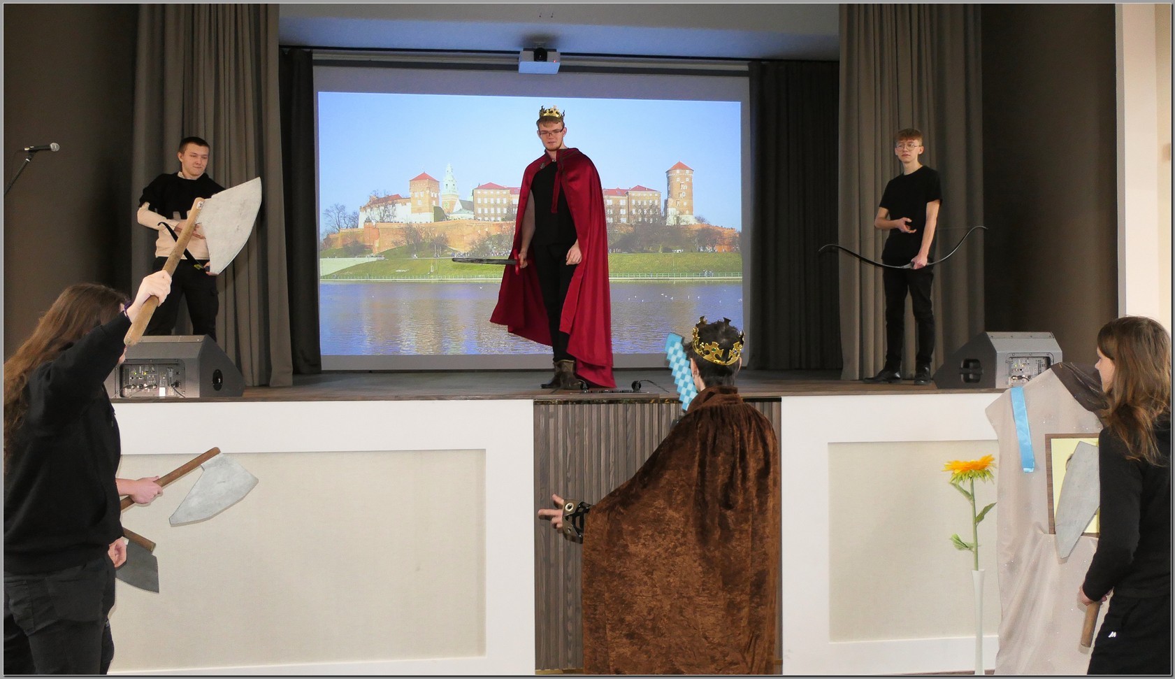 W części artystycznej uczniowie 3 PIN w nowoczesny sposób przedstawili Kazimierza Wielkiego – patrona szkoły, a uczniowie klasy 2 TRF w symboliczny sposób za pomocą pantomimy ukazali patrona auli. Uczniowie połączyli doświadczenie z nowoczesnością. Stroje średniowieczne, dzięki pani Jolancie Binkowskiej – kustoszowi szkolnemu, oddały tradycje, a pantomima masek i drewnianych ramek w rytm remiksu muzyki klasycznej oddały ponadczasowość tradycji społeczności Budowlanki.