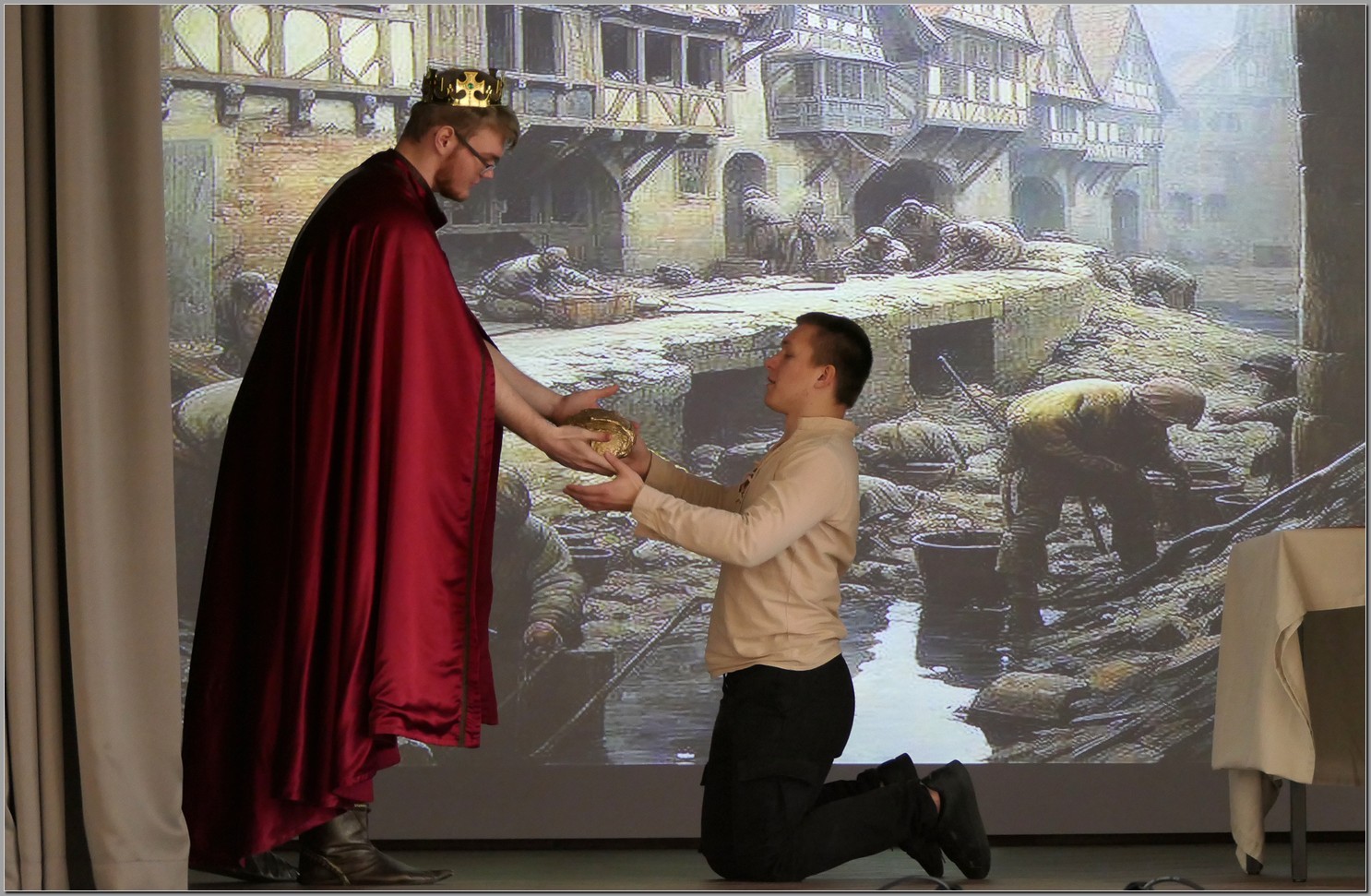 W części artystycznej uczniowie 3 PIN w nowoczesny sposób przedstawili Kazimierza Wielkiego – patrona szkoły, a uczniowie klasy 2 TRF w symboliczny sposób za pomocą pantomimy ukazali patrona auli. Uczniowie połączyli doświadczenie z nowoczesnością. Stroje średniowieczne, dzięki pani Jolancie Binkowskiej – kustoszowi szkolnemu, oddały tradycje, a pantomima masek i drewnianych ramek w rytm remiksu muzyki klasycznej oddały ponadczasowość tradycji społeczności Budowlanki.