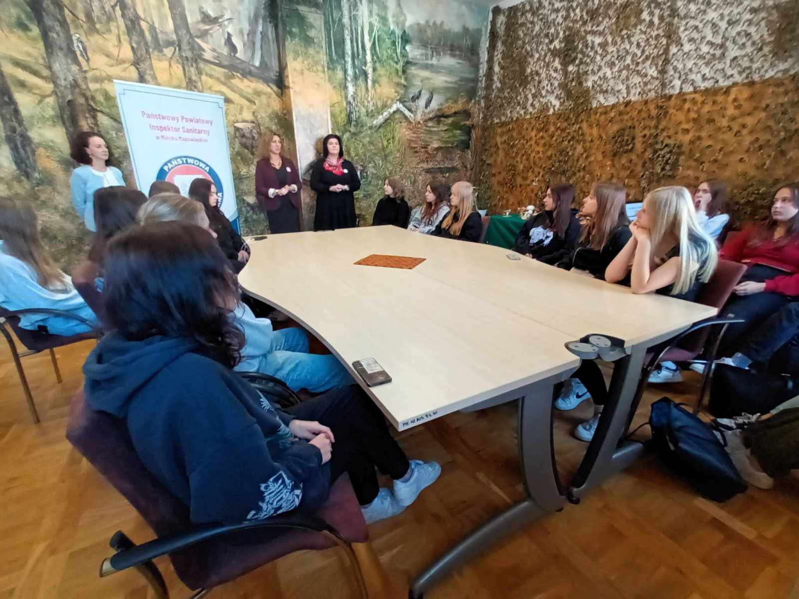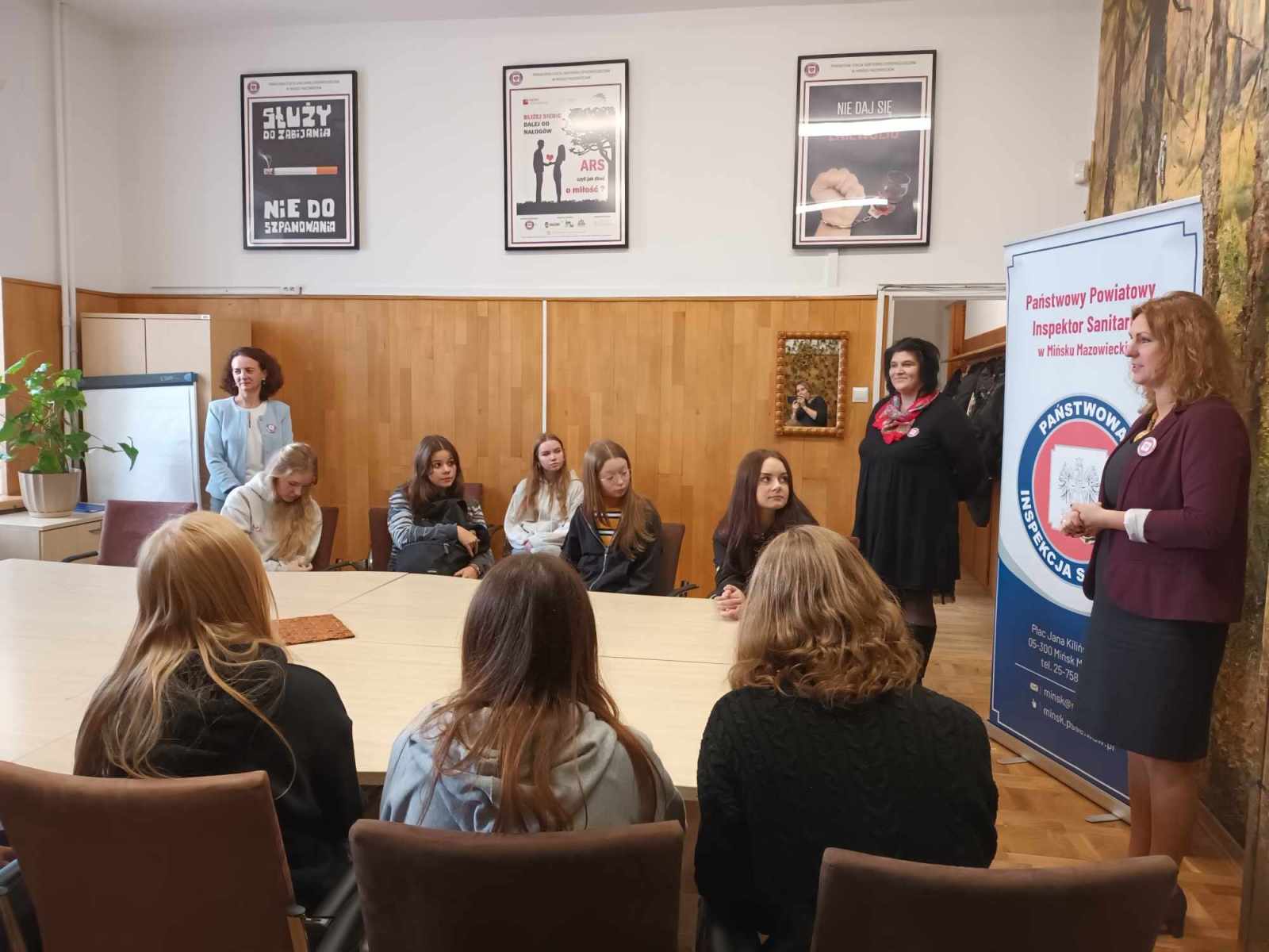 11 października uczniowie ???? klasy 2 PE wraz ze szkolnym koordynatorem programów profilaktycznych Wiolettą Kucińską uczestniczyli w spotkaniu z Dyrektorem Powiatowej Stacji Sanitarno-Epidemiologicznej dr n. med. Dorotą Ziuzią-Lipiec. Niezwykła atmosfera podczas zwiedzania mińskiego sanepidu pozwoliła zapoznać uczniów z działaniami: