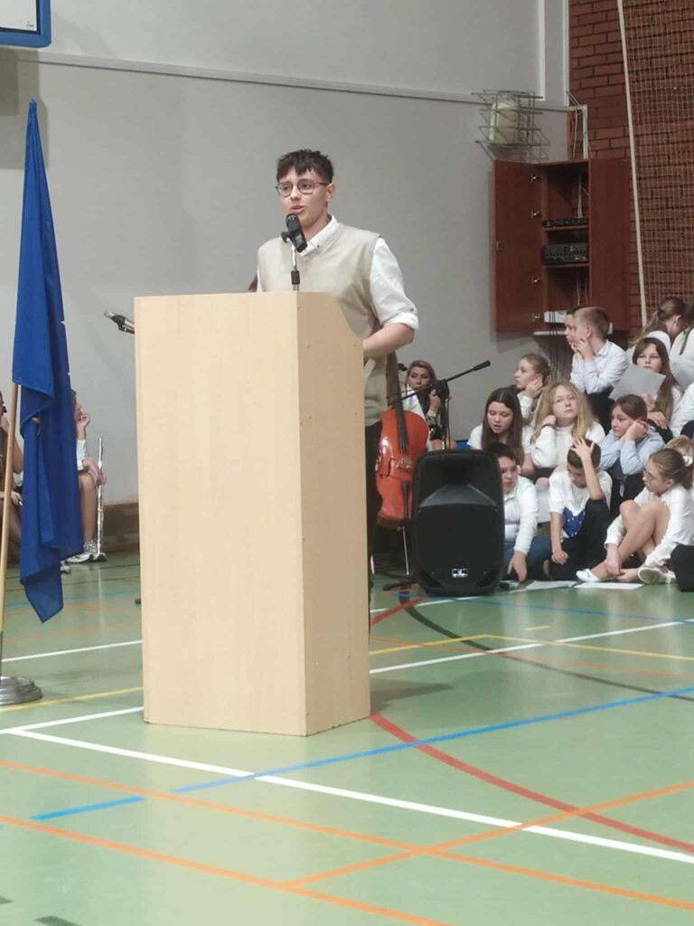 Najważniejszymi gośćmi byli jednak nasi uczniowie – Młodsi Ambasadorzy EPAS oraz członkowie SKE ze szkół podstawowych – bez nich żadne działania promujące wartości wspólnej Europy nie doszłyby do skutku. O tym jak ważne są działania młodych ludzi, jak dzięki aktywności w EPAS i SKE czują, że mają wpływ na funkcjonowanie UE i swoje życie pięknie mówili Mateusz Główka z EPAS – Zespół Szkół im. M. Skłodowskiej – Curie oraz Pani Małgorzata Dróżdż – Starszy Ambasador EPAS Zespół Szkół nr 1 im. Kazimierza Wielkiego w Mińsku Mazowieckim.
