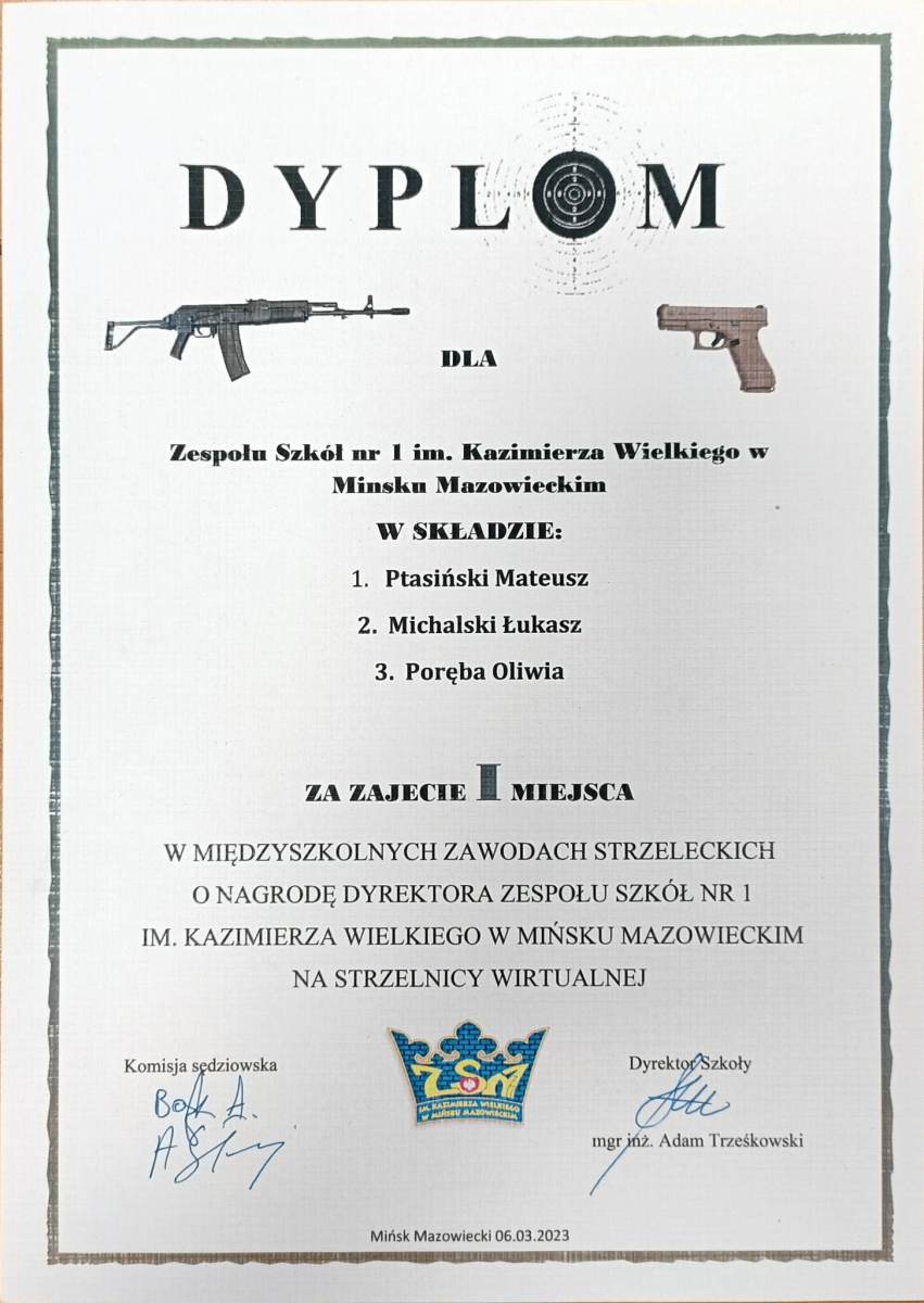 6.03.2023 r. W NASZEJ SZKOLE NA WIRTUALNEJ STRZELNICY ODBYŁY SIĘ MIĘDZYSZKOLNE ZAWODY STRZELECKIE O NAGRODĘ DYREKTORA ZESPOŁU SZKÓŁ NR 1 IM. KAZIMIERZA WIELKIEGO W MIŃSKU MAZOWIECKIM. KLASYFIKACJA PRZEDSTAWIA SIĘ NASTĘPUJĄCO: