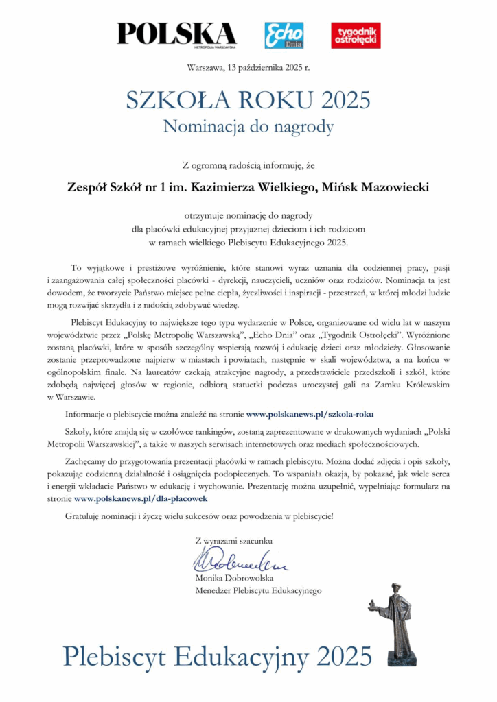 ☺️ Z dumą informujemy, że Zespół Szkół nr 1 po raz kolejny został nominowany do nagrody Szkoły Roku w Plebiscycie Edukacyjnym 2025 organizowanym przez redakcje: „Polski Metropolii Warszawskiej”, „Echa Dnia” oraz „Tygodnika Ostrołęckiego”. Ponadto nominację do nagrody dla najlepszych nauczycieli otrzymali Monika Staruzik i Łukasz Rogala 💛✌️