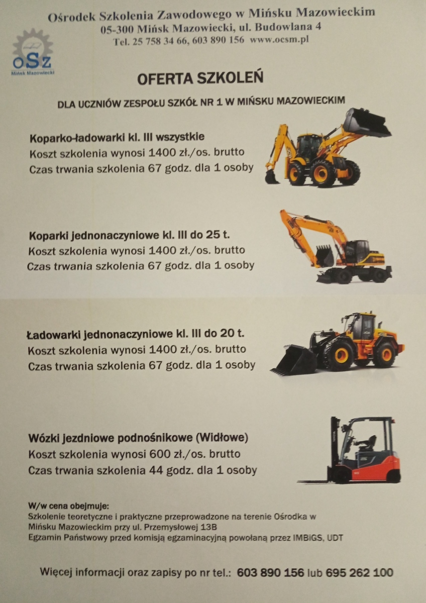 OFERTA SZKOLEŃ dla uczniów Zespołu Szkół nr 1 16 listopada 2022 Drodzy Uczniowie, na poniżej umieszczonym zdjęciu znajdziecie ofertę szkoleń, ofertę jaką przygotował dla Was Ośrodek Szkolenia Zawodowego w Mińsku Mazowieckim. Pokaz slajdów