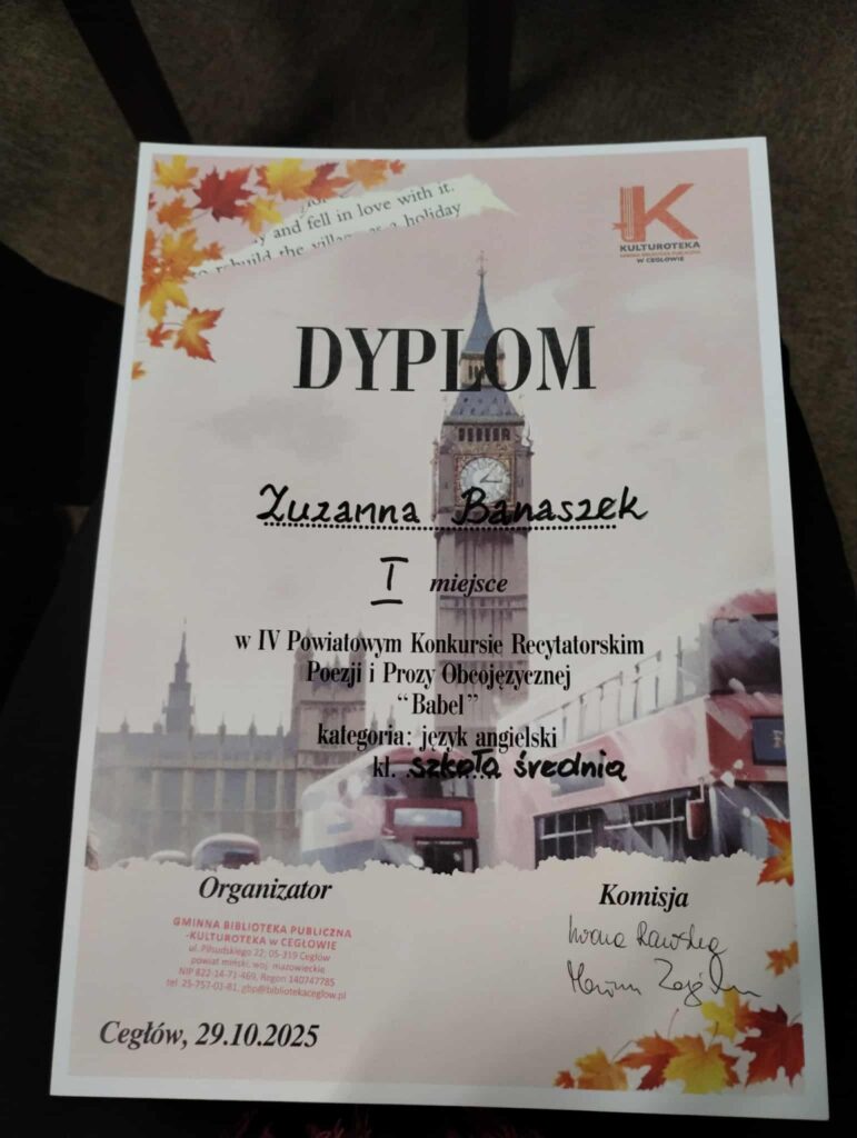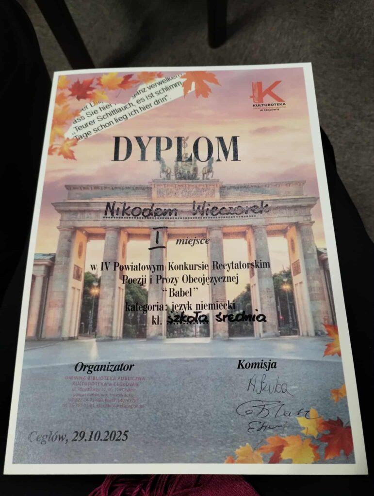 Żaden język w Zespole Szkół nr 1 nie jest nam obcy. 29.10.2025 r. w IV Powiatowym konkursie Poezji i Prozy Obcojęzycznej „Babel” 🗣️Nikodem Wieczorek z klasy 3INF zajął I miejsce w kategorii Język niemiecki 🏆 Zuzanna Banaszek z klasy 2PR zajeła I miejsce w kategorii Język angielski 🥇Gratulujemy!!! ♥️