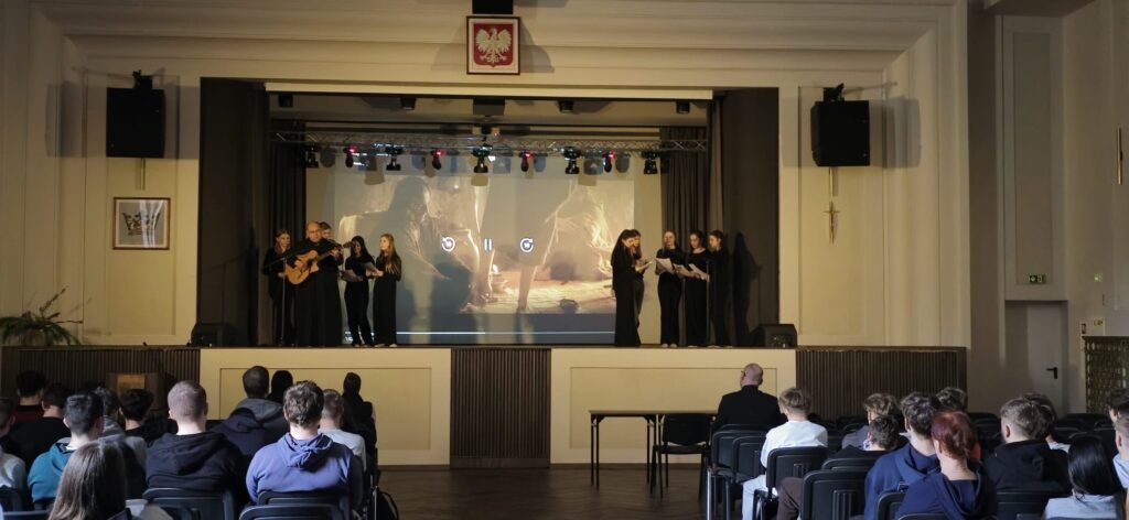 Prowadzone rozważania ubogacone były pokazami wybranych fragmentów filmu „Pasja”, pieśniami w wykonaniu Uczennic z klasy 2 PP oraz ksiedza Wiesława, jak również pokazem tanecznym Dziewczyn.