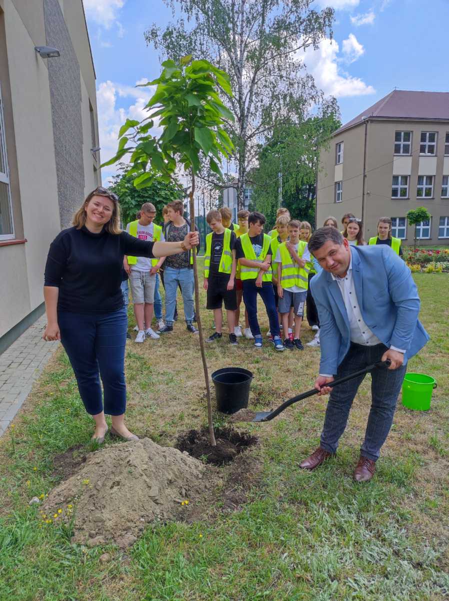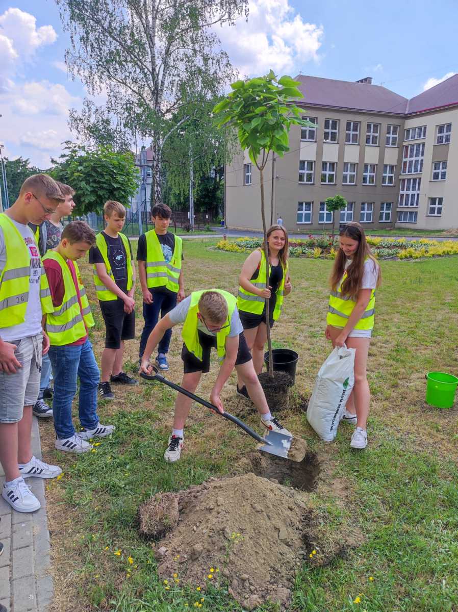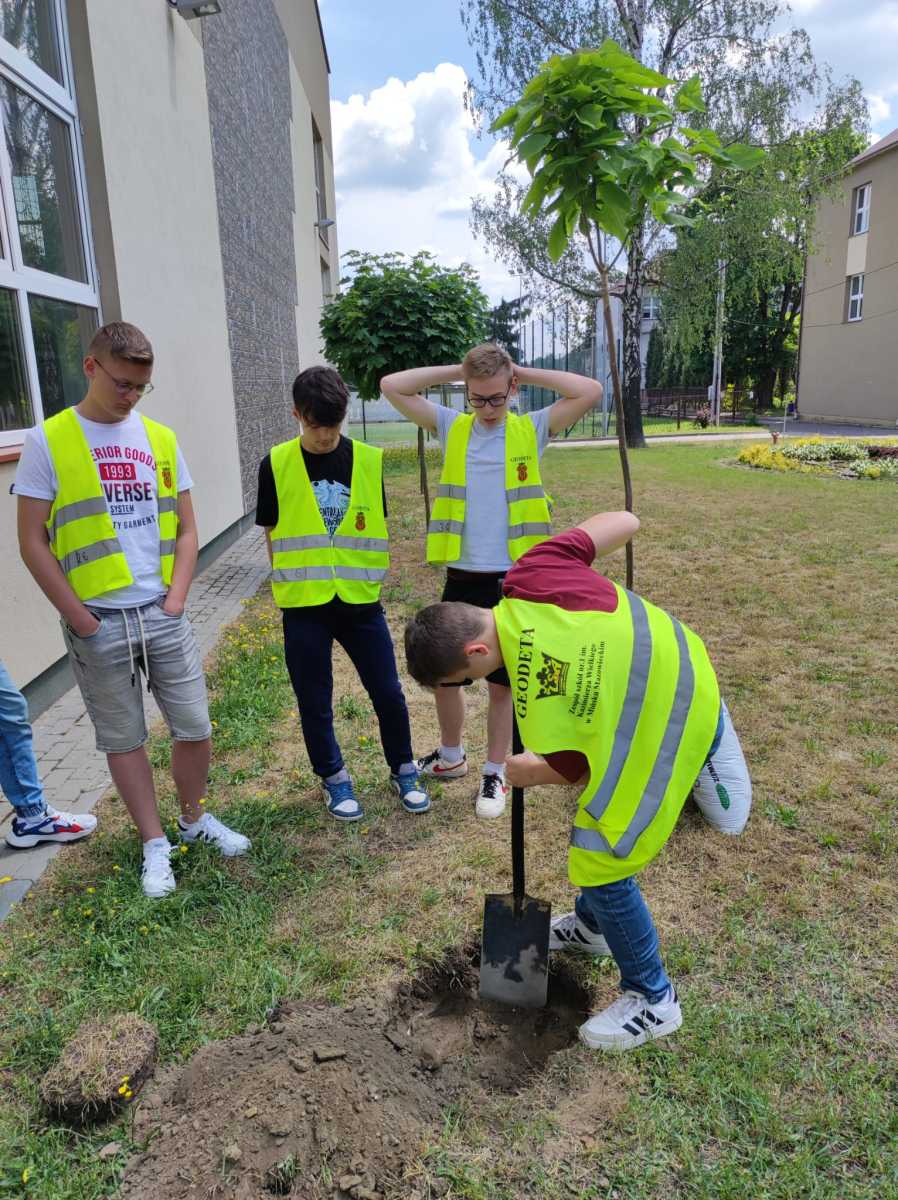 Sadzenie drzewa 23 czerwca 2023 Klasa 1 GE wraz z dyrektorem Adamem Trześkowskim oraz opiekunką Edytą Kosiorkiewicz posadzili drzewo ? na terenie naszej szkoły. Drzewo zostało sfinansowane z funduszy projektu „Logika ekologii” ♻️ organizowanego przez Fundację Dzieci i Młodzieży. Pokaz slajdów