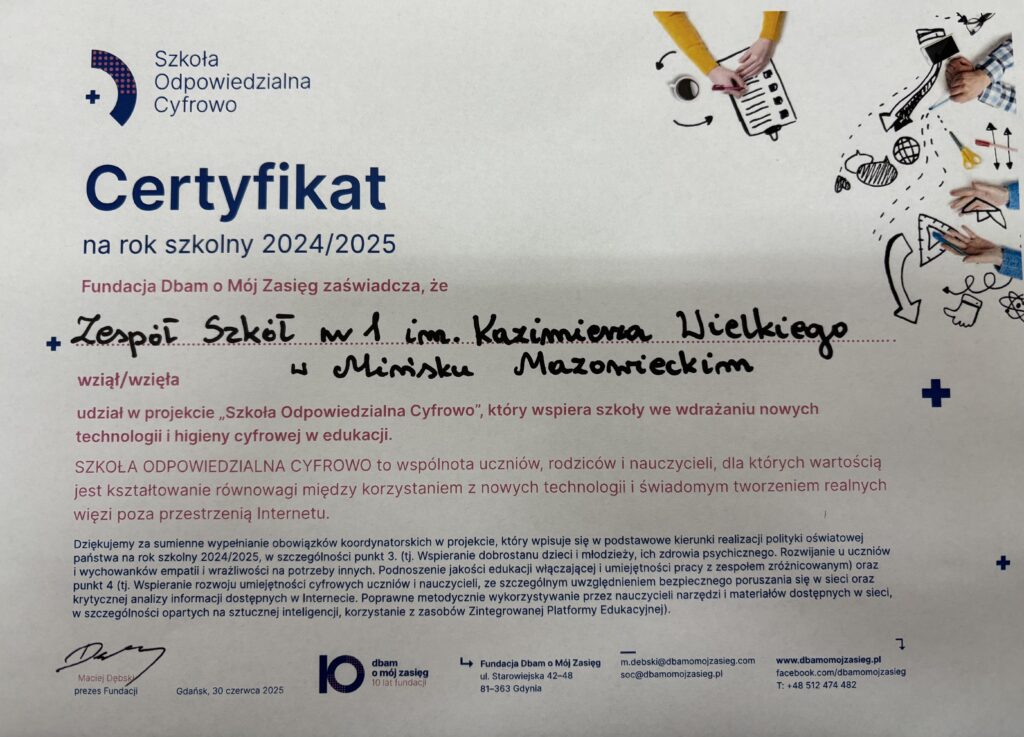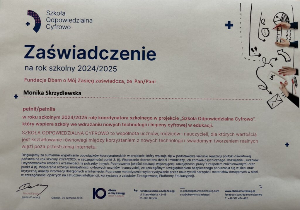 👩💻🛜 Nasza placówka wzięła udział w projekcie „Szkoła Odpowiedzialna Cyfrowo”, który wspiera szkoły we wdrażaniu nowych technologii i higieny cyfrowej w edukacji. Koordynatorką ze strony ZS1 była wicedyrektor Monika Skrzydlewska.