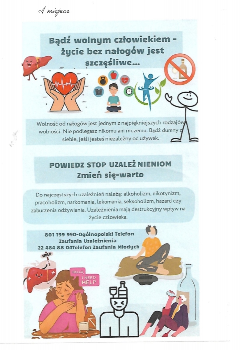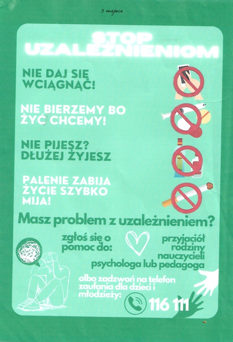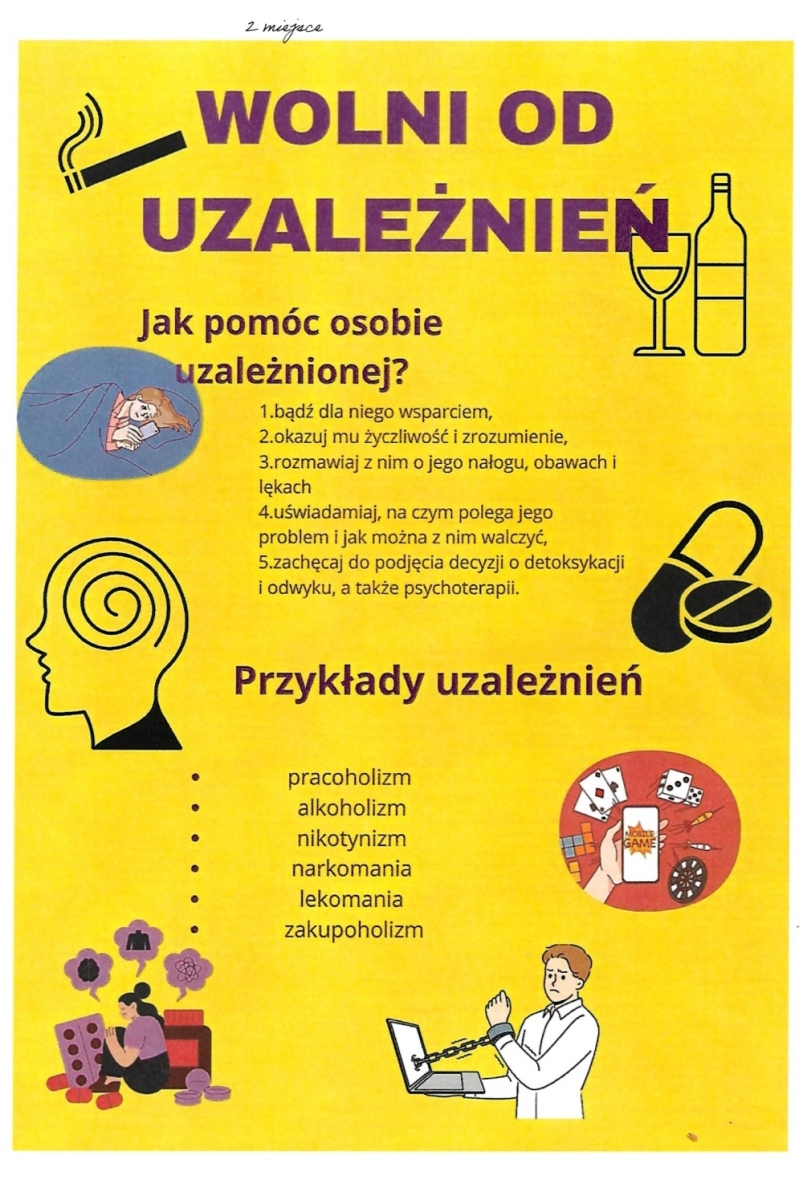 ? ? Konkurs adresowany był dla uczniów klas I LO i T. Miał na celu zainteresowanie młodzieży problemem uzależnień i skutecznej walki z nimi. W ramach konkursu uczniowie przygotowali projekt ulotki informacyjnej na temat uzależnień.