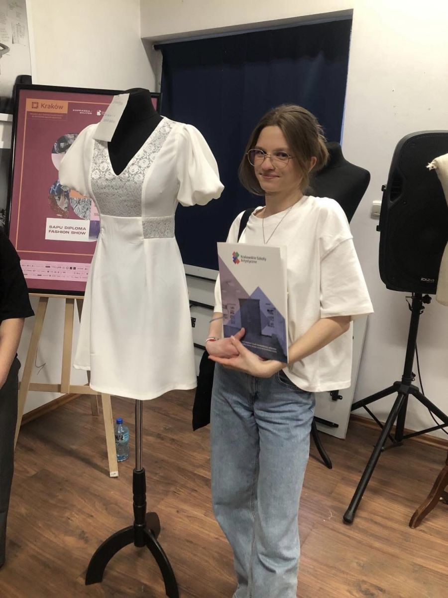 Maja uszyła białą sukienkę z koronkowymi wstawkami. Konkurs pozwolił zdobyć cenne doświadczenie i nawiązać nowe znajomości. Dziękujemy Pani Małgorzacie Dumicz za przygotowanie i opiekę.