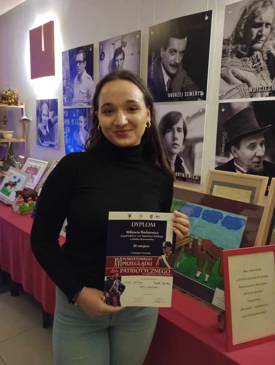 XVI powiatowy przegląd patriotyczny w Mrozach 7 listopada 2023 Gratulujemy Wiktorii Rodziewicz z klasy 2 PC, która zdobyła 3 miejsce na XVI powiatowym przeglądzie patriotycznym w Mrozach! Wyróżnienie otrzymała za recytację utworu „Dwie śmierci”. Opiekunem artystycznym była Dorota Chodorska. Brawo! ? Pokaz slajdów