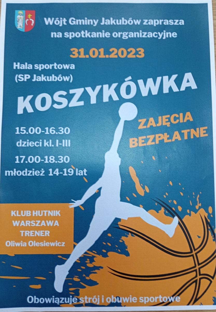 W wyniku oddolnej inicjatywy możliwe staje się uruchomienie klubu koszykarskiego w Jakubowie. Odbędzie się to we współpracy z najlepszym takim klubem w Warszawie i na Mazowszu: Energia Basket Warszawa (Hutnik Warszawa). Zapraszamy na spotkanie organizacyjne – wstępny nabór poprowadzi i zajęcia koszykarskie poprowadzi Oliwia Olesiewicz, trenerka koszykówki i była zawodniczka zespołów koszykarskiej Ekstraklasy oraz reprezentacji Polski juniorów.